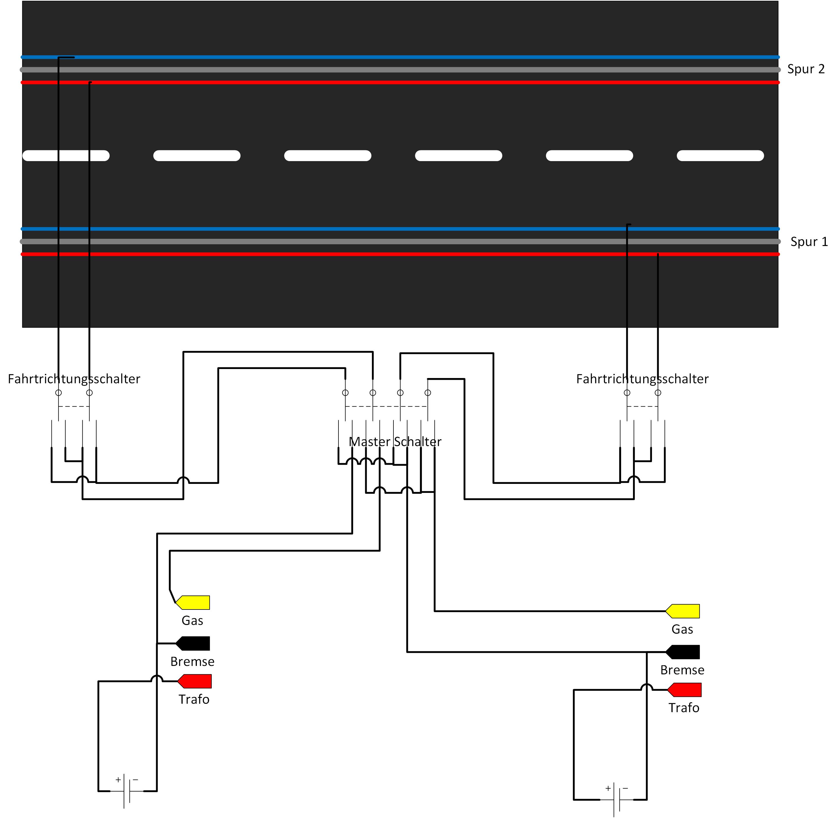 Als weiteres Feature wollte ich gerne einen Master Regler haben. D.h. ich kann die Box so schalten, dass ein Regler beide Spuren bedient. Gerade wenn man viel alleine fährt ist das sehr praktisch, da man nur einen Regler anschliessen muss und trotzdem ohne umstecken mal die eine oder die andere Spur befahren kann. Ist der Master Modus eingeschalten, steuert also der Regler von Spur 1 auch die Spur 2 und der Regler von Spur 2 ist ohne Funktion und muss garnicht vorhanden sein.