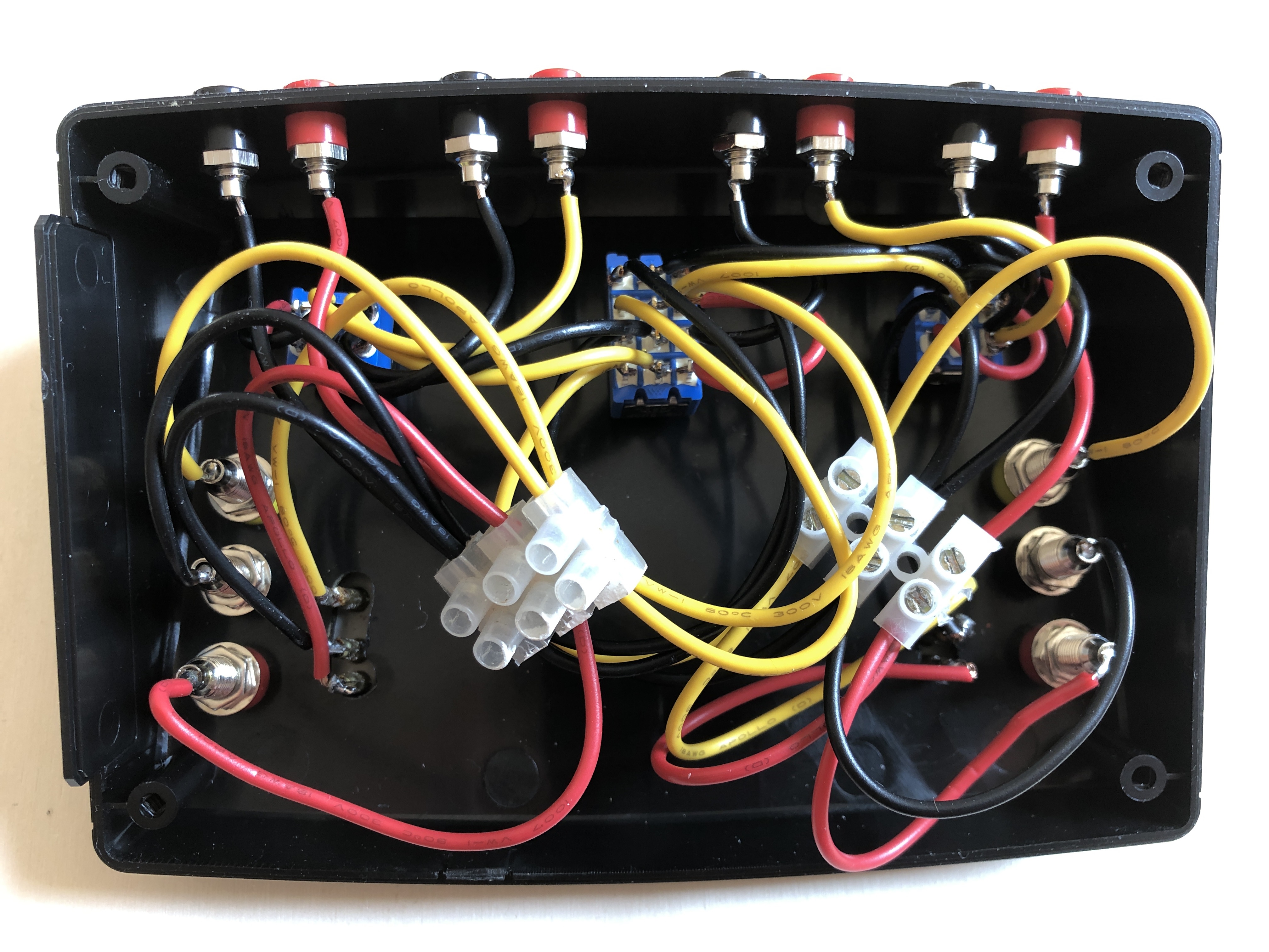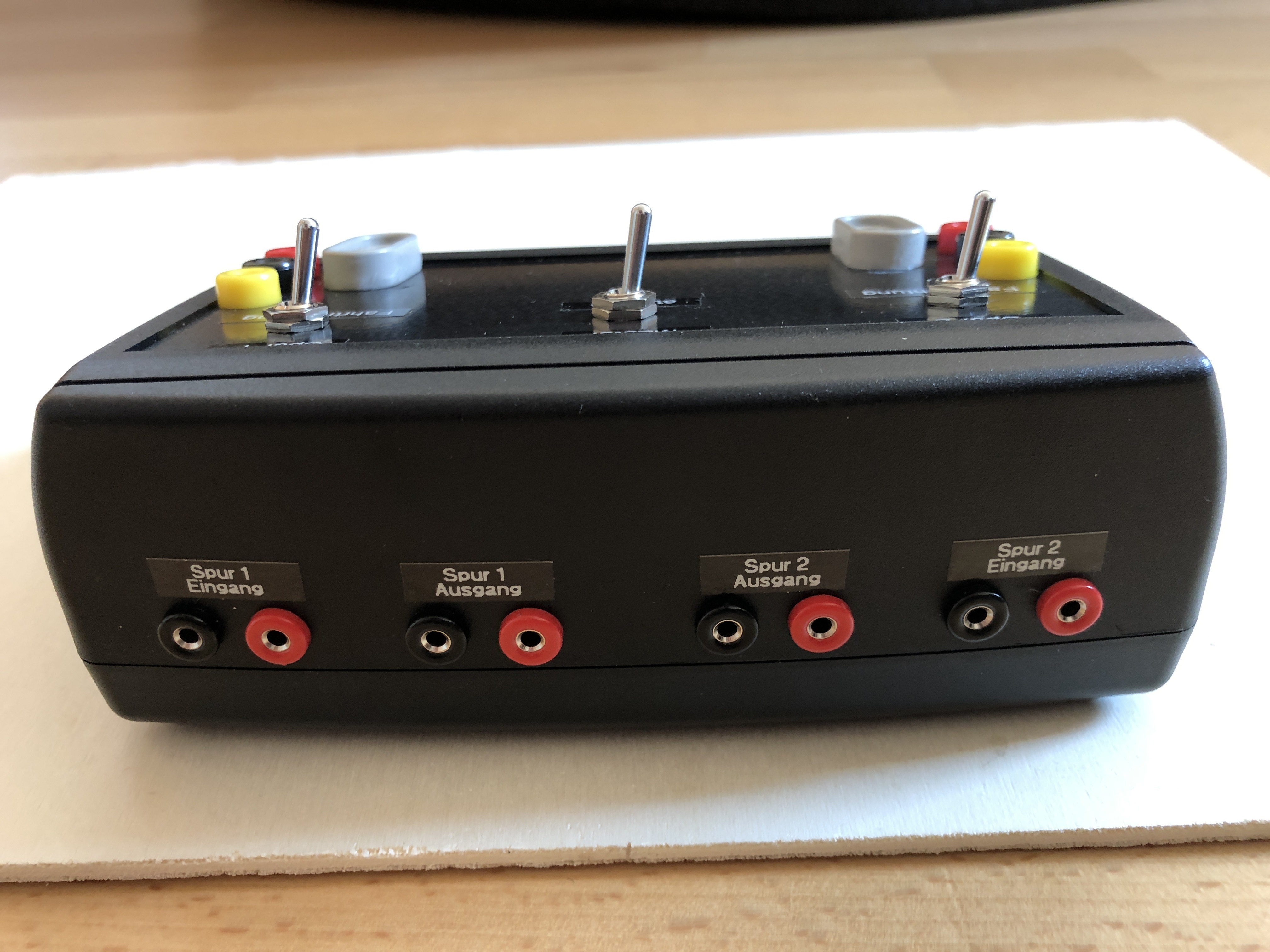 Mit der Zeit haben sich immer mehr Bastelprojekte rund um die Bahn ergeben und so war es nur eine Frage der Zeit bis auch eine Anschlußbox gebaut werden musste. Wichtig war für mich vor allem, daß ich sowohl die alten Carrera Daumendrücker anschließen kann, als auch andere Drücker. Daher habe ich mich dazu entschieden aus einer Carrera 124 Anschlußschiene die Drückeranschlüsse zu verwenden und auch 4mm Buchsen gemäß der deutschen Steckerbelegung einzubauen. Damit kann ich dann die zahlreichen Carreradrücker ohne Umbau weiter verwenden aber auch die Parma Pistolenregler, welche ich vor einiger Zeit erworben habe.