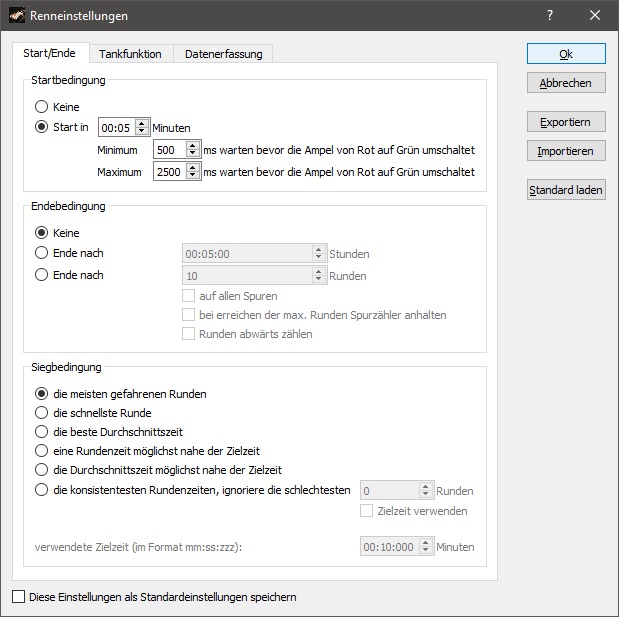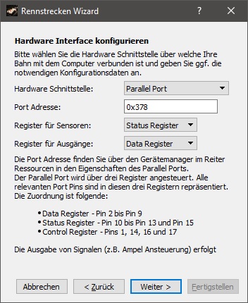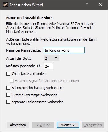Das Anlegen einer neuen Rennstrecke ist spielend leicht. Einfach Name, Maßstab und Anzahl der Spuren und ggf. vorhanden Zusatz-Hardware auswählen ...
